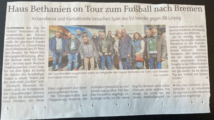 Kontaktstelle und Krisendienst on Tour…..Viel Spaß, Freude, Zusammenhalt und das Wir-Gefühl zeichneten unsere Fahrt zum Werder Spiel gegen Leipzig aus. Eine schöne Truppe hatte sich für die Fahrt nach Bremen zusammen gefunden. Start war um 11.45 Uhr vom Marktplatz in Cloppenburg aus. 20 Personen nahmen teil. Die Fa. Kohorst-Reisen brachte uns sicher zum Zielort. Unsere […]