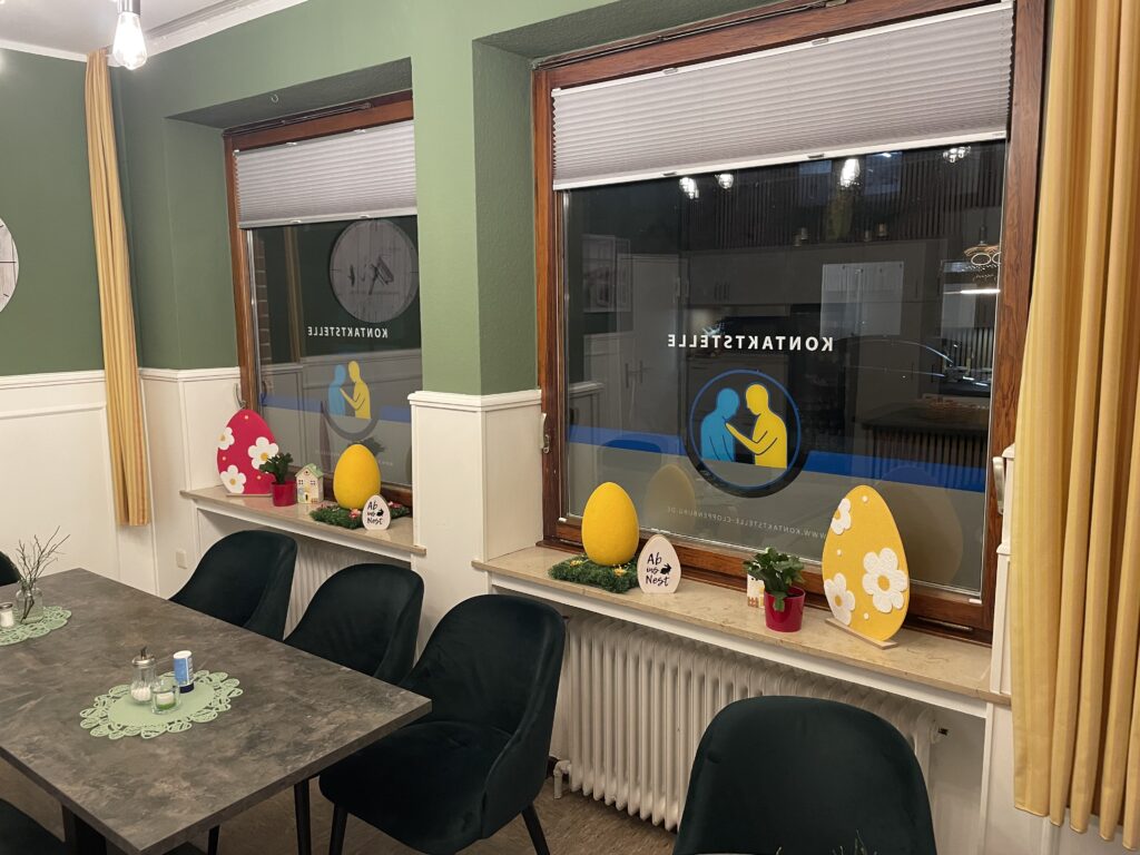 An den Osterfeiertagen 2026 ist die Kontaktstelle mit angegliedertem „CaféZeit“ wie gewohnt für Euch geöffnet. Die fleißigen Osterhasen in unserer „Kontaktstellenfamilie“ haben die Dekoration nebst kleinen Geschenken schon Anfang März vorgenommen. Wir bereiten uns gemeinsam auf das höchste Fest der Christen vor und feiern dann zusammen die Auferstehung des Herrn, ohne den es häufig im Alltag nicht geht. Allen Gästen unseres Hauses frohe, friedvolle Tage in österlicher Freude.